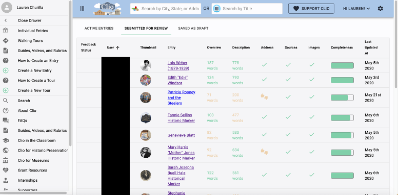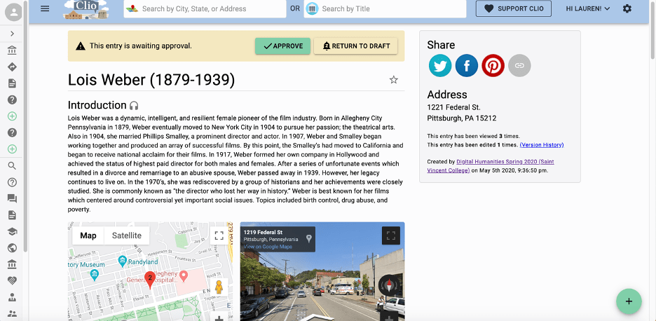 I have used The Clio Project for several years in my Pennsylvania History and Digital Humanities classes as an alternative to a traditional research paper. Students can use this tool on their phone or on a computer so it is easily accessible to students without a computer or reliable internet access. I have found greater engagement with this project and more quality results as I have found my students excited to participate in a project and produce something that is part of a real public project. Also, because they are aware that they are contributing to a public forum, they seem to be more accountable with the quality of information they are creating and more attentive to citations. This past semester, I worked with a colleague and we had our students create entries for Pennsylvania Historical Markers of significant women. We came up with a list of 70 entries and when the project is complete, we will create a state-wide tour in The Clio of these sites. I have found it better to give students a list of topics or places, because all entries must be locationally based and students sometimes have difficulty selected a topic that can easily be plotted on a map.