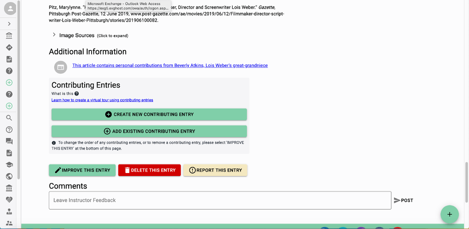 When you click on an individual entry, you can review a student’s work and make comments. There is not a good in-text editor or notation system, so I either type my comments in all caps within the text or use the “comments” tool at the bottom of the page. When an article is ready to go public, the instructor can approve it using the button at the top of the page.