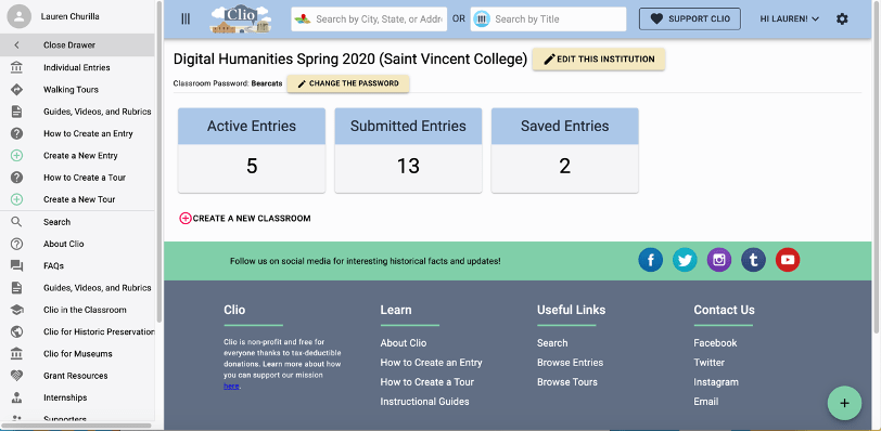 The Clio in the Classroom allows you to create specific dashboards for each class you teach. Every class has a unique login that students can use to access the class and create an entry. From the instructor side, you can see student progress in real time. You will notice that each course has “active entries,” “submitted entries,” and “saved entries.” An entry can only be made active by an instructor. No student entries will be made public while they are being constructed and edited. A student can continuously work on an entry and save it in draft form. When they are ready to submit it for instructor review or grading, they submit the entry.