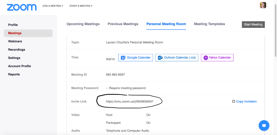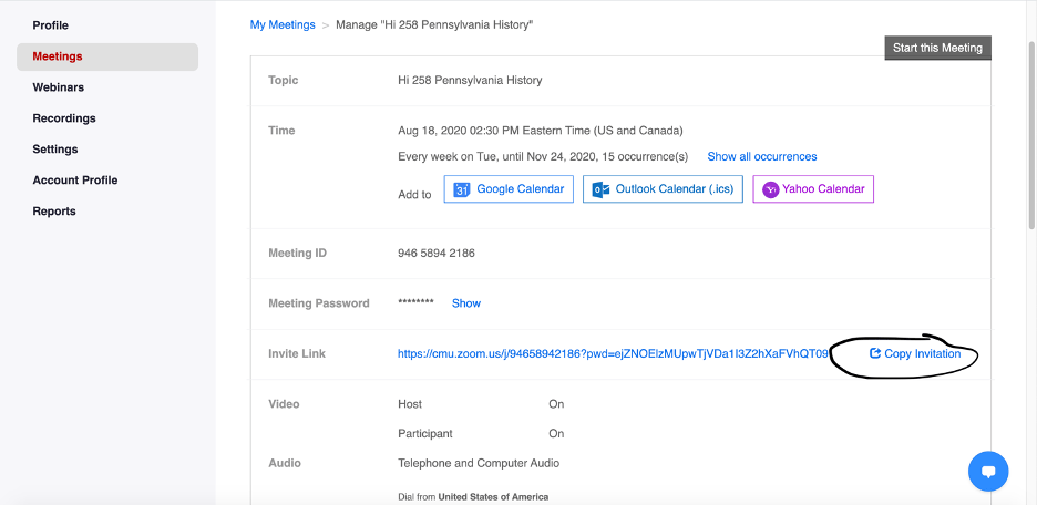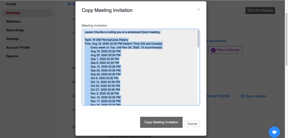 15. When you are done, a meeting link will generate. In order to share this with you class, copy the invitation by clicking the link circled below:
