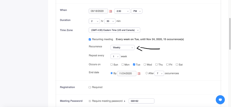1. After this, you can select the meeting’s recurrence. Zoom allows you to select daily, weekly, monthly, and no fixed time meetings. I have chosen weekly since my class meets once a week. If your class will be meeting multiple times, simply select all of the weekdays days that the course will meet synchronously.