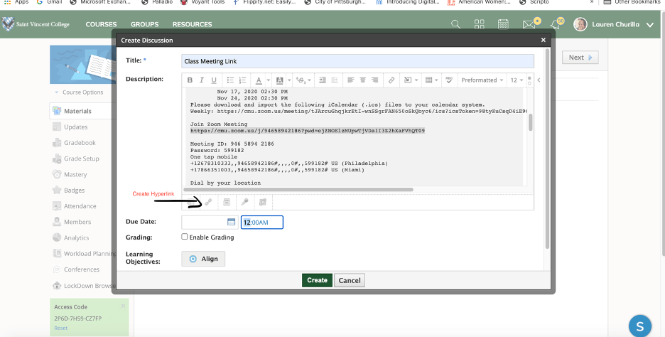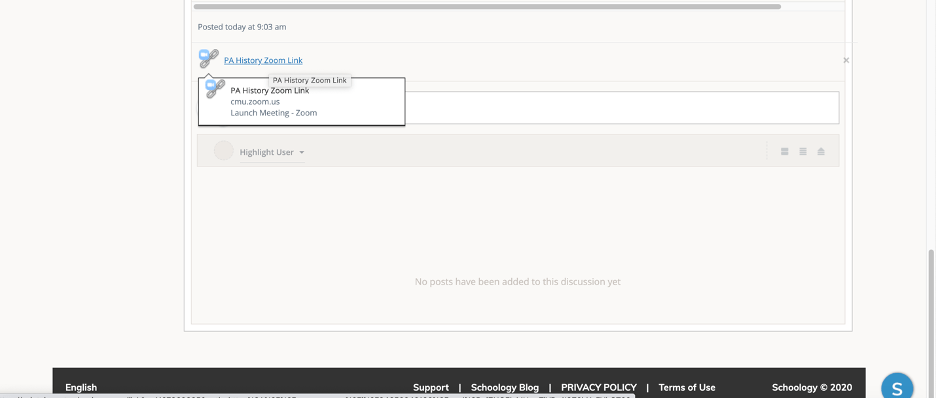 1. I am embedding my meeting into Schoology so that my students will easily have access to the link. I created a folder called “Class Meeting Link” and posted the full invitation. For ease of access and for students who do not want or need to scroll through all the information in the full invitation, I created a hyperlink for the “Join Zoom Meeting” link using the hyperlink tool in our LMS.