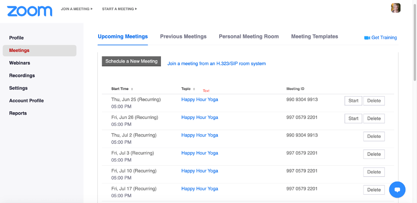 When you login to Zoom, you will be able to set up instant or scheduled meetings. These meetings appear on your dashboard like mine do in my example below.
